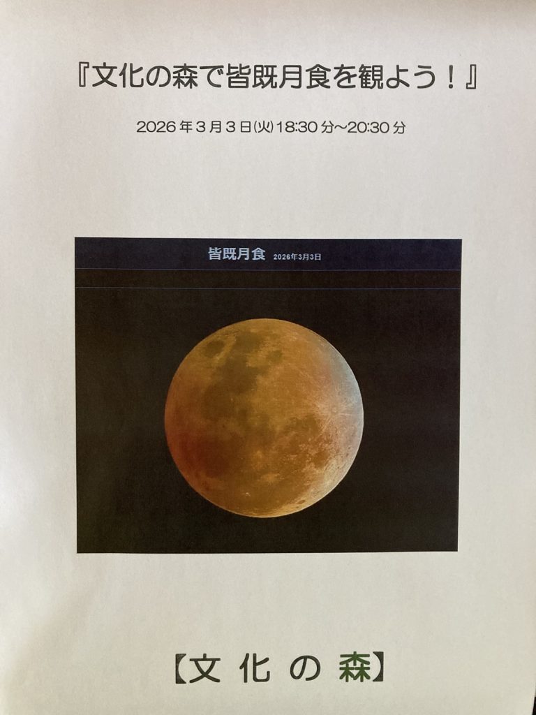 2026年3月3日(火)雛祭りの夜に見られる天体ショー『皆既月食』を文化の森では特別開園し、先着30名様に限り観測場所を提供させていただきます。