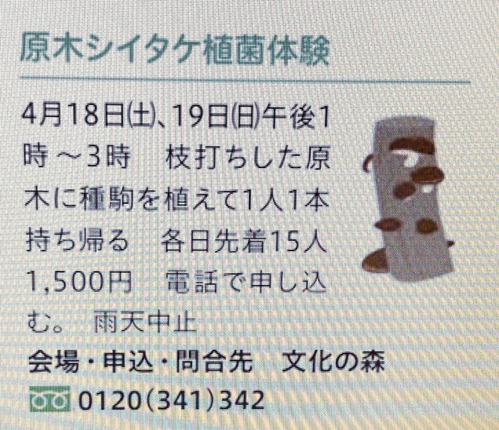 いただき、その原木1本をお持ち帰りいただき自宅で育てていただくイベントです。